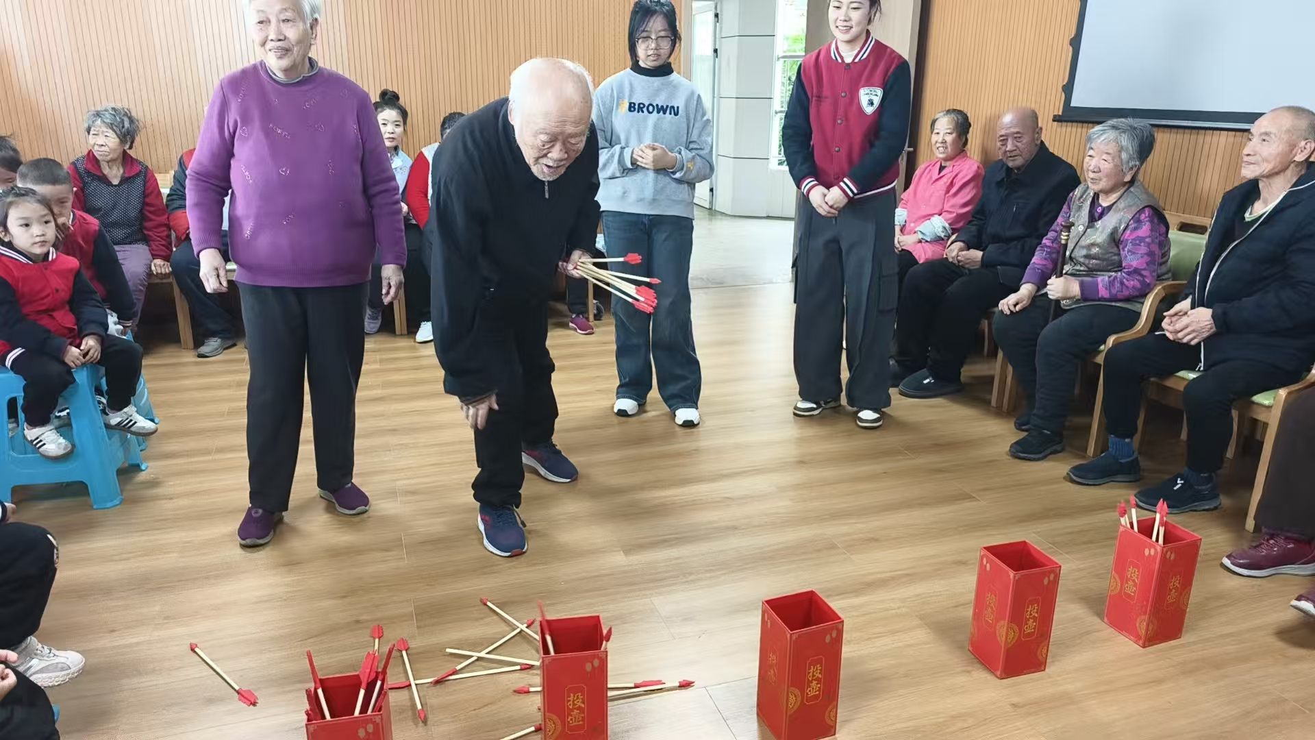 本次活动在颐养中心隆重举行,现场布置温馨,节日气氛浓厚。中心为长者们准备了趣味盎然的传统投壶游戏,长者们踊跃参与,一试身手,在轻松愉快的游戏中仿佛回到了青春岁月,脸上洋溢着孩童般的笑容。“这个投壶游戏让我想起了小时候玩的游戏,今天玩得特别开心,感觉自己又年轻了一回!”今年72岁的李大爷兴奋地说。