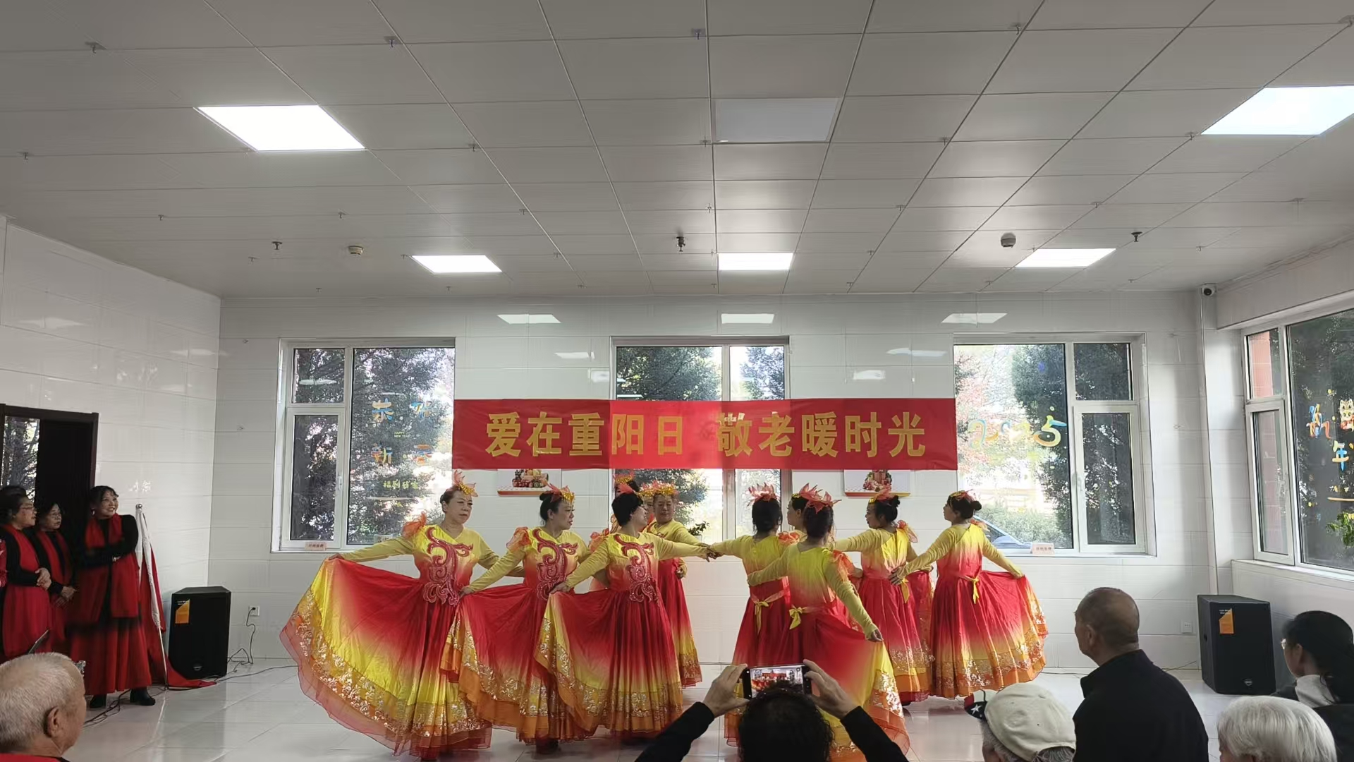 随后,来自各社区及志愿团体的文艺骨干登场,带来形式多样的节目:既有深情款款的大合唱《我们的中国梦》《幸福中国一起走》、感人至深的《绣红旗》《一晃就老了》,也有优雅曼妙的扇子舞、诙谐幽默的戏曲选段《亲家母》、喜庆洋洋的《红红的灯笼挂起来》,还有独具特色的《蛾曼》表演,每一个节目都赢得老人们阵阵掌声。更令人动容的是,中心入住的长者们精神矍铄地登台,献上精心排练的大合唱——他们用歌声展现出老有所乐、积极向上的精神风貌,成为演出中最温暖的亮点。参加合唱的刘奶奶激动地表示“能在台上为大家表演,我们感到特别自豪。虽然年纪大了,但我们依然热爱生活,喜欢唱歌。”