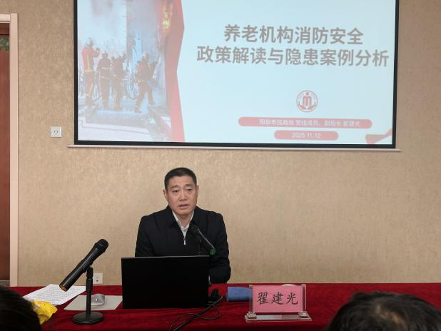 培训会上,翟建光围绕国家消防救援局、民政部联合印发的《关于切实采取过硬措施坚决防范遏制养老机构重特大火灾事故的通知》(消防〔2025〕41号)要求,紧贴阳泉养老机构安全管理实际,围绕“全面压实消防安全责任、严查突出风险隐患、严格整治重点问题、严格事故责任追究和警示教育、强化火灾风险监测预警、建立中度以上(含中度)失能老年人生活单元、照料单元安全防护体系、加大资金支持力度、大力提升从业人员消防安全素质、推进高效办成‘养老机构开办’一件事”九个方面和《养老机构消防安全整治重点技术要求》的七个方面“楼层设置和平面布局、居室设计和护理员配比、安全疏散和避难逃生、防火分隔和装修装饰、消防设施和值班值守、用电和用火安全管理、预案制定和培训演练”的内容进行详细解读。有效提升了参训人员对政策法规和技术标准的理解、把握与执行。